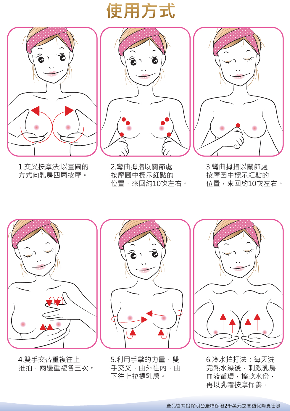 活力美胸凝膠:清潔並拭乾肌膚後,取適量「美胸精華」塗抹於胸部肌膚按摩至吸收即可。