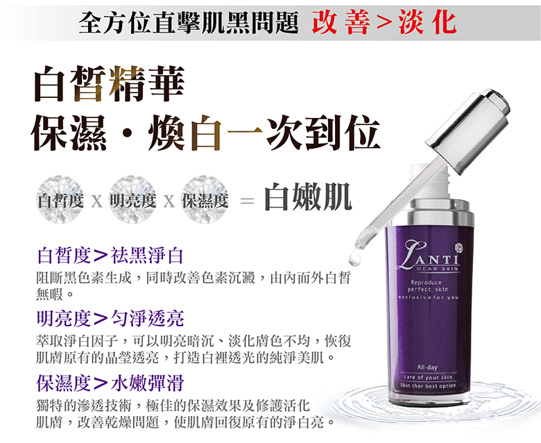 ◆商品名稱:  Lanti雷射光超導美白水潤精華液