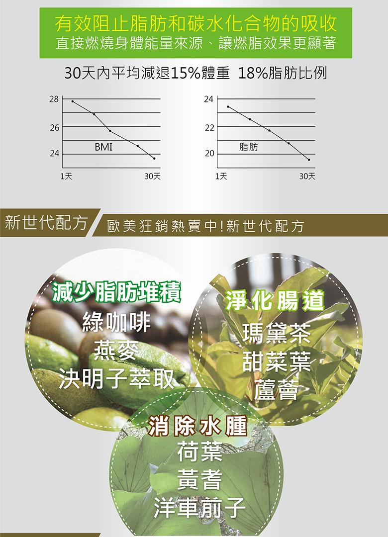 成 分:綜合植物蔬果發酵物 (柑橘、蘋果、櫻桃、梅子)、乳酸菌(Lactobacillus acidophilus)、藍藻、蘆薈、人蔘、馬黛茶、巴西梅、荷葉、黃耆、菠菜、檸檬草、決明子、燕麥、黃豆纖維、麥草、咖啡粉末。。